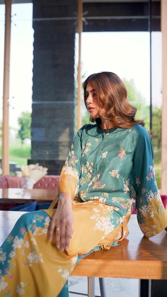 A vibrant fusion of elegance and comfort, this 2-piece Viscose Rayon co-ord set blends teal and mustard tones with delicate floral artistry. The medium-length top is styled with a graceful straight cut for a flattering fit, while the flowy culotte pants create a breezy, modern silhouette. Perfect for brunch dates, casual meetups, or travel chic looks.